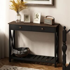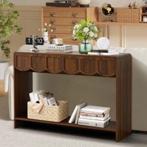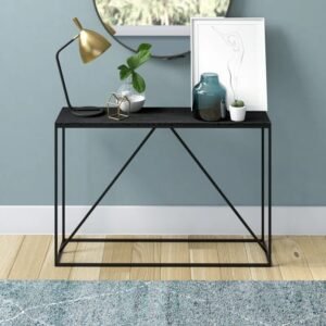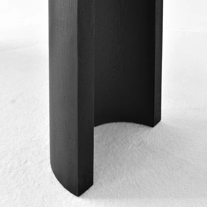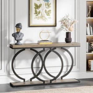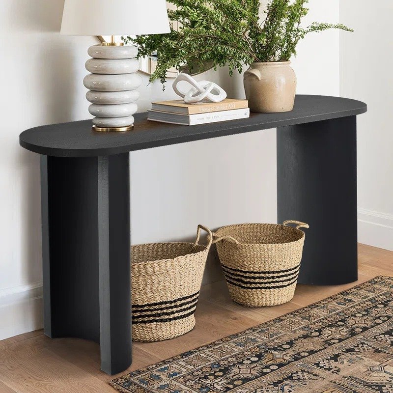 هل ترغبين في قطعة أثاث تمنحكِ حرية الابتكار وتغيير مظهر الغرفة بلمسة واحدة؟ إليكِ طاولة كونسول سوداء بتصميم فني مذهل وشكل بيضاوي انسيابي. ما يجعل هذه الطاولة استثنائية هو أرجلها المقوسة بذكاء؛ حيث يمنحكِ التصميم خيار تثبيتها باتجاه الداخل لمظهر ملموم وجذاب، أو باتجاه الخارج لمنح الطاولة طابعاً أكثر اتساعاً وجرأة. بفضل عرضها الكبير (152 سم) ولونها الأسود الفخم، تعد هذه الطاولة قطعة “بيان” (Statement Piece) مثالية خلف الأرائك الكبيرة أو في المداخل الواسعة، حيث توفر سطحاً رحباً لعرض المزهريات الضخمة والمصابيح بأسلوب معماري حديث يخطف الأنظار.